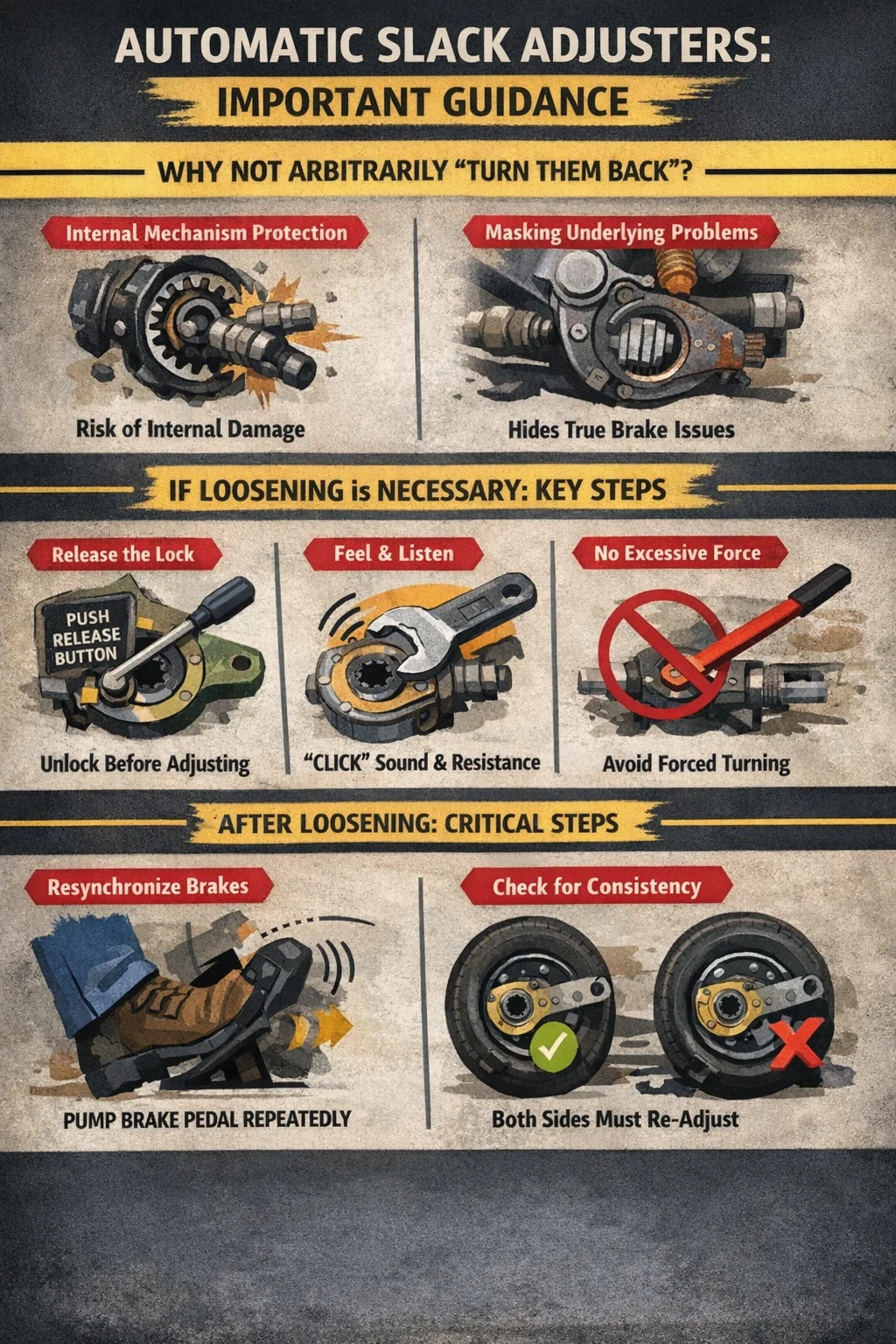 ↳ Risincronizzazione: è necessario premere ripetutamente il pedale del freno (di solito richiedendo più pressioni a piena pressione) per consentire al regolatore automatico del gioco di regolare nuovamente il gioco nella posizione più ragionevole attraverso la sua funzione di compensazione automatica.