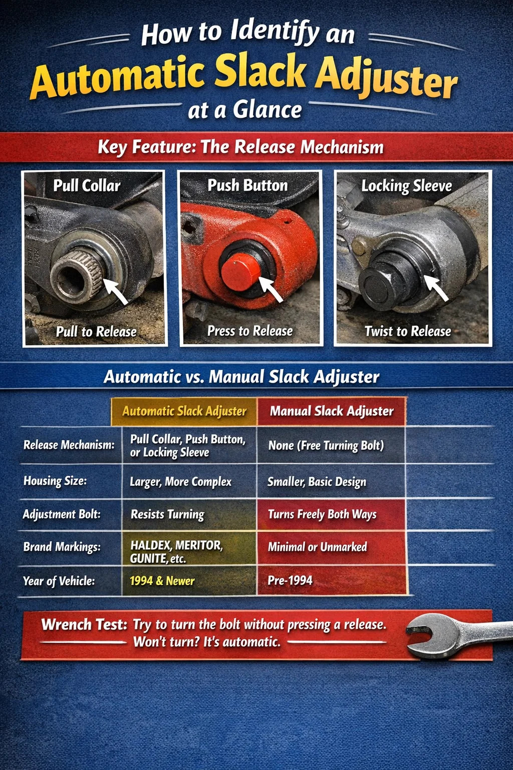 Cosa significa in pratica: se stai lavorando su un camion o un rimorchio costruito negli ultimi 30 anni, dovresti aspettarti che i regolatori del gioco automatici siano predefiniti. I regolatori manuali sui veicoli successivi al 1994 rappresentano una modifica non conforme, un'applicazione speciale o militare oppure un'apparecchiatura che è stata sottoposta a manutenzione in modo errato. Se vedi quello che sembra essere un regolatore manuale su un veicolo più recente, è un segnale di allarme che vale la pena indagare prima di eseguire qualsiasi intervento sui freni.