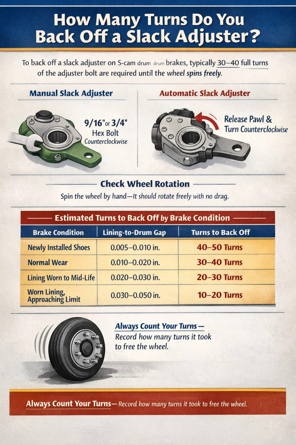 Queste cifre presuppongono un sistema di camma a S standard con un passo della filettatura che produce approssimativamente 0,025 pollici di movimento del rivestimento per giro completo del bullone di regolazione. I regolatori Haldex, Gunite e Meritor rientrano tutti in questo intervallo, sebbene esistano piccole differenze tra le linee di prodotto.