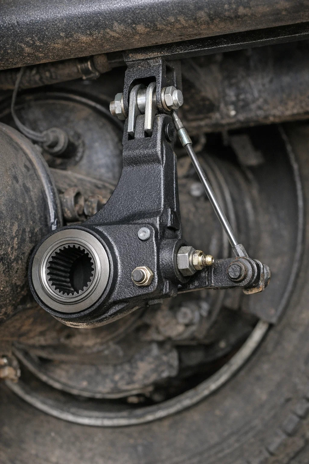 Nella sua parte superiore (l'estremità più sottile), è strettamente collegato all'asta di spinta proveniente dalla camera del freno tramite un morsetto metallico a forma di U (forcella) e uno spesso perno metallico.